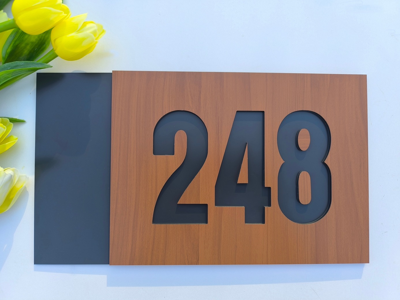 Toto popisné číslo je dvojvrstvové (z dvoch vrstiev) - zadajte prosím farbu hornej tabuľky a farbu dolnej tabuľky. Ak je napr.farba hornej tabuľky drevodekor a farba spodnej tabuľky čierna, pri pohľade na číslo budete číslice vidieť v čiernej farbe (do vrchnej tabuľky čísla vyrezávame a preto farbu spodnej tabuľky vidieť). Má výrazný 3D efekt, čo vytvára moderný, vizuálne atraktívny vzhľad.